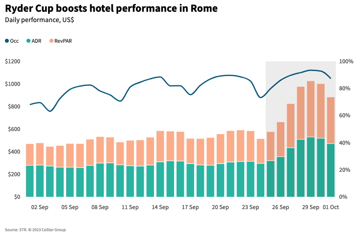The Ryder Cup, a bi-annual golf competition between teams from Europe and the United States, was hosted in Rome in the final days of September through 1 October. During the seven-day period of leadup activity and competition, Rome’s hotel industry reported its highest daily ADR and RevPAR levels ever recorded (29 September: $524.14 and $490.12, respectively). In addition, it was the first time that daily ADR reached $400 in Rome since late-May 2009.