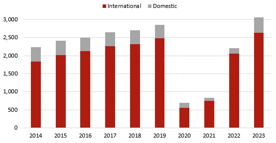 The discrepancy in recovery rates between hotel arrivals and airport passenger movement can be attributed to growing competition from the extra-hotel market, particularly vacation homes and farmhouses, which experienced significant growth following the pandemic. Additionally, this shift led to a noticeable decrease in the average length of stay at hotels, declining from 2.6 days in 2019 to 2.2 days in 2023.